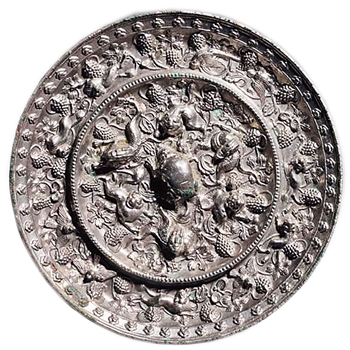 为什么要把海兽与葡萄组合在一起作为装饰,到目前为止还没有确切解释。有的学者认为它来源于古代的波斯或希腊罗马。葡萄,又叫蒲桃,自汉代张骞出使西域带回中原后,开始广泛种植,到唐代时,葡萄的种植已非常流行,葡萄纹也频繁用于丝绸装饰。瑞兽纹在铜镜装饰上流行已久,在六朝、隋、唐初的铜镜上极为盛行。由于唐代对外交流广泛,受中西文化的影响,艺术家、工匠们极易在制镜时把中西艺术巧妙结合,形成具有民族风格的纹样。这两种纹样在大唐宽松多元的文化氛围下交融为一体,成为中国铜镜装饰纹样由瑞兽纹向花鸟植物纹转变的特殊产物,在铜镜史上占有不可取代的重要地位。