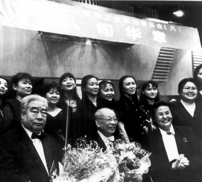 1997年6月7日,郑小瑛率爱乐女室内乐团,与李德伦、黄飞立(中)合作举办八旬华章音乐会。图为演出后合影。