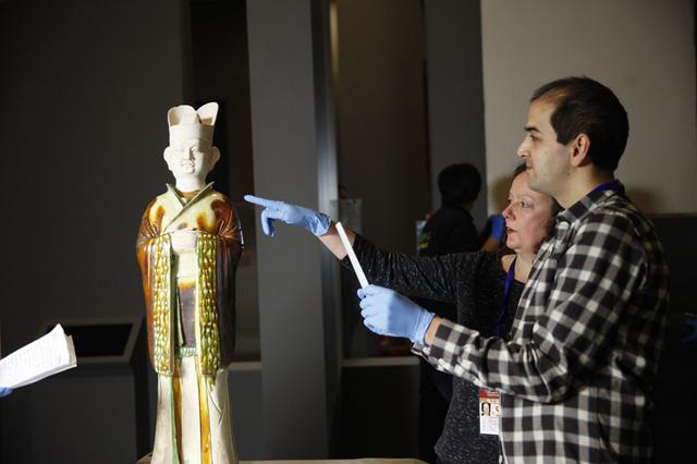 2月底,大英博物馆工作人员在中国国家博物馆布展三彩文官俑 拍摄:周子杰
