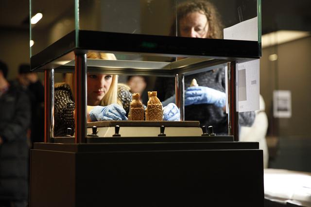 大英博物馆工作人员在布展刘易斯棋子。 拍摄:周子杰