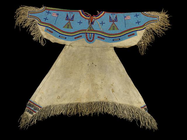 在展览中,还有一件由加拿大梅蒂斯人(注:印第安人与白人通婚的后代)制作的长外衣。它用了原住民的传统材料,但外形是欧式的。由于传统材料非常脆弱,它也无法长期展出。在堪培拉的展览结束之后,我在大英博物馆库房挑选了一件北美印第安苏族人制作的童装,作为它的替代品。