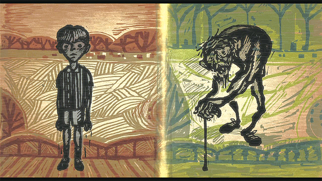 细细看来,这部短片的很多情节是令人匪夷所思的。譬如,表现维莎眼中那个向她求爱的男人时,影片以独白的方式交代了她自言自语的过程。右眼望着那个拄着拐杖的老头子,维莎对自己说:“哦,我的天啊,他闻起来就像烂泥。”然而,这分明是嗅觉的信息——如果维莎仅仅是眼睛有问题,不应该能闻得到老人身上的气味。当然另一种可能是男人正在一滩臭水沟边向维莎表白,但这又不太现实……还有,当维莎望着窗外时,左侧画面中出现了她的手,手指修长,看上去是青年女性的手;可窗外的树那时候还很矮小,影片暗示这是维莎左眼看到的很多年前的画面。或许如若出现的是一只孩童的小手,这画面会更具可信感。但瑕不掩瑜,这部影片凭借着一个基础性的背景设定,已足以成为一部极具魅力的作品。