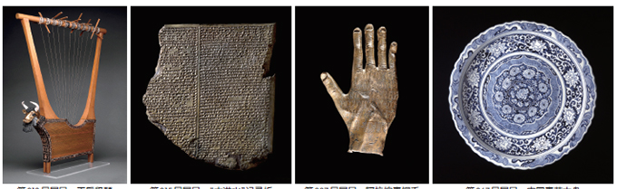 图1:第013号展品 王后竖琴 图2:第015号展品 “大洪水”记录板 图2:第037号展品 阿拉伯青铜手 图2:第067号展品 中国青花大盘