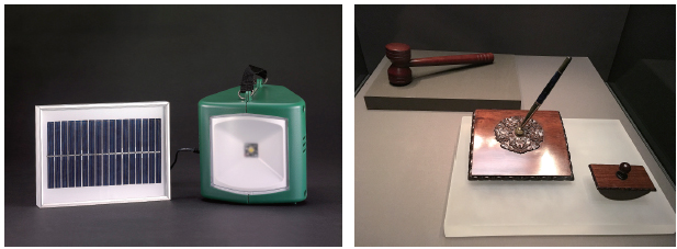 左图:第100号展品 太阳能灯具与充电器 右图:第101号展品 宣布中国重返世贸组织的木槌和中国重返世贸组织的签字笔