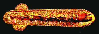 ①蒂拉丘地出土的“双龙”图案黄金剑鞘。本报记者 李韵摄/光明图片