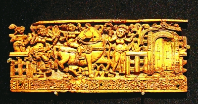 ②贝格拉姆出土的印度风格象牙饰板。本报记者 李韵摄/光明图片