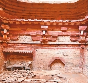 据介绍,该墓葬为一仿木结构彩绘砖雕墓,由墓道、墓门、封门和墓室等四部分组成,墓道南向。墓道为长方形竖井式,斜坡底;墓门券顶,条砖封门;墓室为砖砌,平面呈方形,叠涩顶,方砖铺地。墓室装饰砖雕仿木结构,包括倚柱、阑额、普拍枋、斗拱、橑檐枋、檐椽、望板、滴水等建筑构件,四壁还用砖雕砌有假门、桌椅、灯檠等。室内壁满抹白灰,并施红、黑、黄彩,其中普拍枋、阑额、拱眼、墓门彩绘有花草纹、波折纹和雷纹,假门两侧还用黑彩绘有人物。根据墓葬形制、装饰风格及出土器物特征,专家初步推测墓葬年代在金元时期。