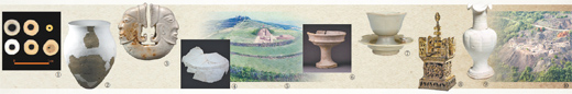 图⑦:该窑址出土的秘色瓷盏与盏托。