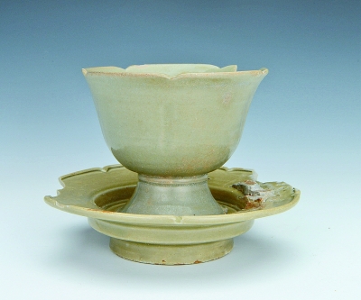 浙江慈溪秘色瓷窑址出土的秘色瓷盏与盏托 资料图片