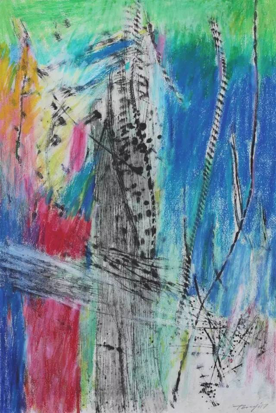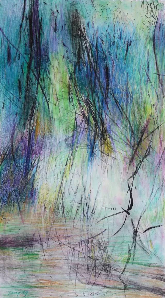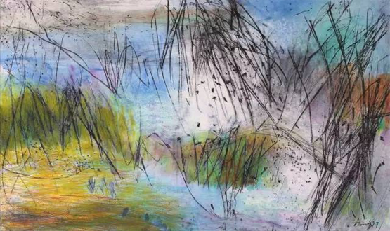 “行走的风景”系列作品以景色为主,色彩绚丽,虽寥寥数笔,但生机却扑面而来。站在他的作品面前,睁开眼睛,是四面笼罩而来的汹涌生命;闭上眼睛,则是交织纵横的眩晕风景。这支画笔是任性的、挥洒的,却又是含蓄的、思索的、耐人捉摸的。吸引我们去捉摸的,不仅仅是如云色彩的铺陈和乐章般的点线跳跃,因为我们仿佛看到了风景,却又希望看到风景背后的离奇。