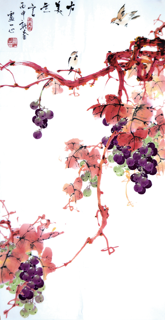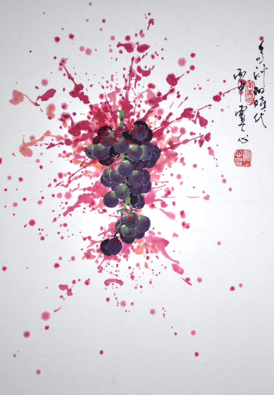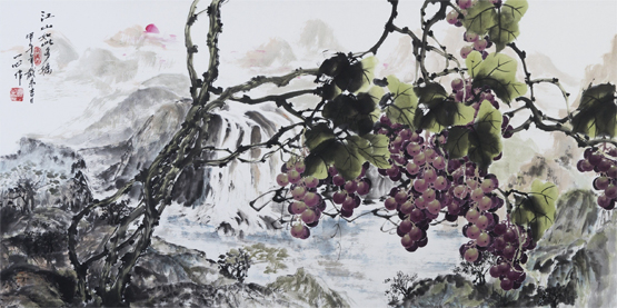 我为葡萄著文,并以葡萄为绘画题材,就是要创造出这种美,这种时代大气魄之美,并让这种美成为每个人心中的梦想。在我的笔下,葡萄就像一位朴素、恬美的村姑从国风中走出来,大方而又腼腆,羞涩而又开放,而我画葡萄的技法,则采用中西结合的方式,将中国画的写意与西洋画的色彩结合起来,让光影与线条互相衬托、辉映,让虚实浓淡产生出另一种新奇效果和审美追求,并进行哲学思考。故我始终对葡萄的原根情结产生好奇并怀着本能的追问。或许,生命的存在及其意义本身就是个谜。