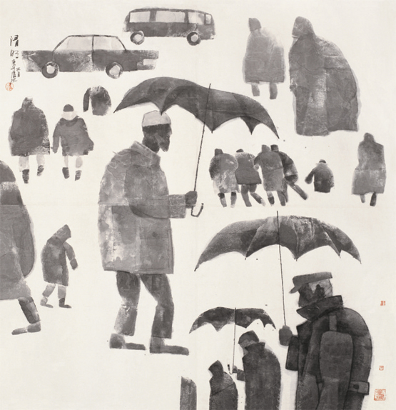 卢沉的探索不仅停留在造型与笔墨层面,上世纪80年代在现代化的大背景下,他追求抽象的思维能力,将西方的构成意识、形式分析的方法应用于水墨画创作之中,《清明》是这一时期的代表作。《清明》表现的是清明雨季路上撑伞的行人,用几何形的平面造型表现人物的侧影、背影,通过形式分析的方法把画面进行了有意味的分割,也辅助指引了观者的欣赏顺序。画面整体的淡墨着色,传达出一种宁静的氛围与悲伤的情绪。这幅画于1990年创作完成之后在中国美术馆和深圳美术馆展出,引起了画坛对卢沉创新精神的进一步关注。