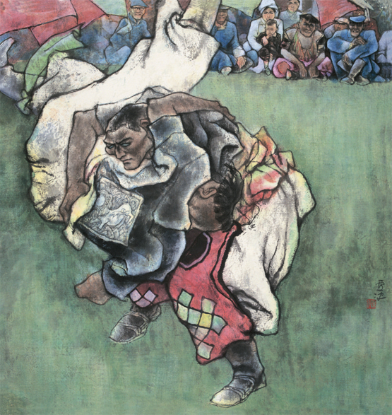 《摔跤手》(水墨设色)