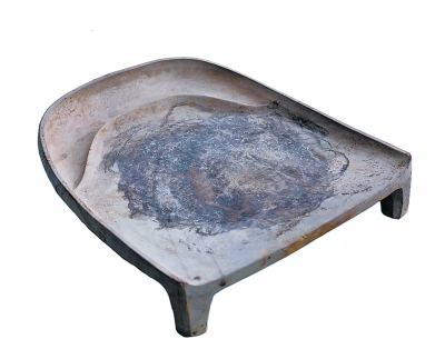 此砚规格硕大,长达32厘米,宽27.5厘米,高5.7厘米。外形呈“风”字状,双足,故称双足风字砚。此种风字砚又因形制类似农具簸箕,也称箕形砚。泥色灰黄,色泽华美,质地坚密细腻。砚体土锈浸蚀,砚堂墨锈斑驳,植物根须沁于砚表,迹近钙化。砚堂与墨池之间有月牙形拦水墙相隔。此砚为盛唐时制品。出土、传世各有一款同类砚品可以互证。