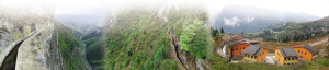 “大发渠”擦耳岩段。黄大发沿着陡峭的绝壁巡查、清理水渠。如今的草王坝村。田维野摄