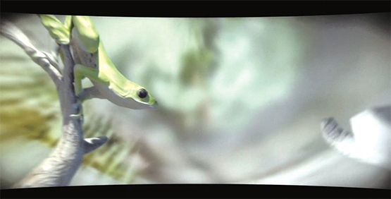 第二,苍蝇眼里的世界。跟许多其他昆虫一样,苍蝇的眼睛是“复眼”,是由数量庞大的六角形小眼所组成的视觉器官,每只小眼都是独立的感光单位。对于苍蝇观看青蛙的表现方式,影片里做了一个“拉”的处理,而且幅度极大:众多复眼中密集排布着吐出长舌的众多青蛙,一时间布满了整个画面,俨然起到了一种特殊的画面分屏效果,可谓非常震撼。