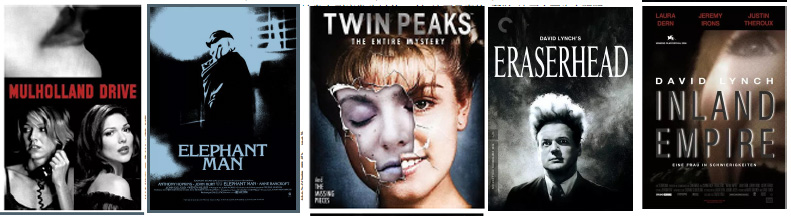 《穆赫兰道》电影海报、《象人》电影海报、《双峰》电影海报、《橡皮头》电影海报、《内陆帝国》电影海报