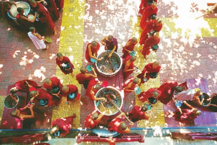 缅甸仰光佛学院用午膳的僧侣