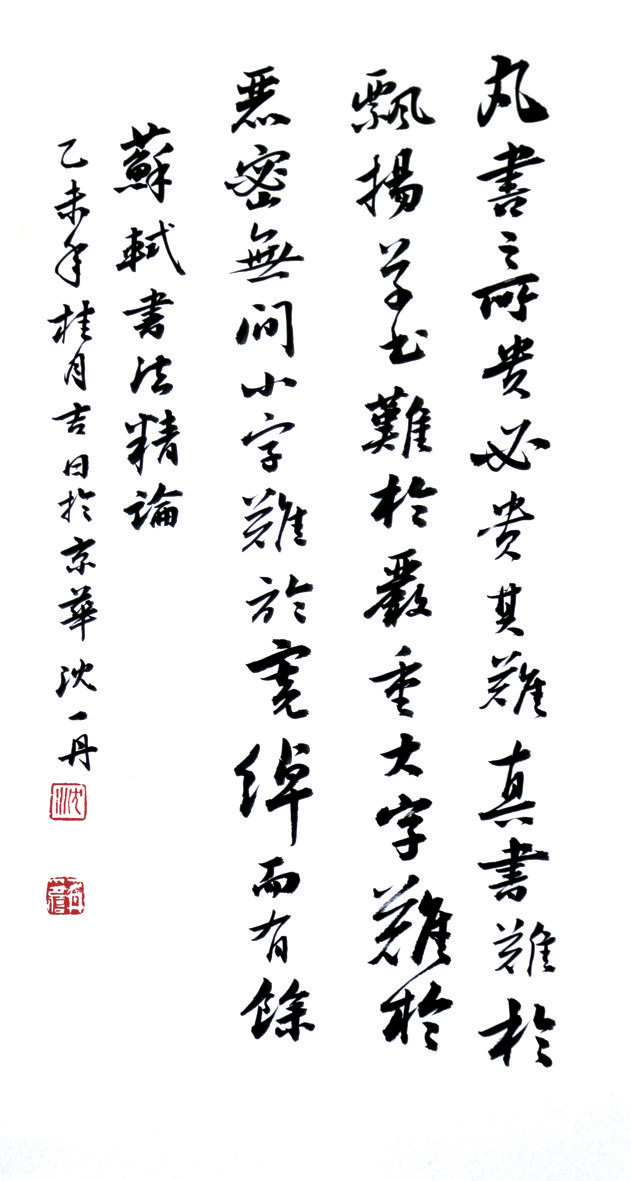 学书还有一些引发争议的问题。比如大楷与小楷,从哪个入手?两种主张都有。恐怕也同上述“楷”、“篆”之争一样,要看个人的爱好而定,不必拘泥一格。宋代米芾说:“小字展令大,大字促令小,是张颠教颜真卿谬论。”米老还举“太一之殿”为例,“岂可将‘一’字肥满一窠以对‘殿’字乎?”以我的理解,“展令大”与“促令小”指字的风范而言,并非简单地指字形大小。再是,传为张旭教颜真卿《笔法十二意》所谓“大字”、“小字”可能实指“大楷”、“小楷”。写大楷要有小楷的韵味,写小楷要有大楷的气势。还是苏东坡说得好:“大字难于结密而无间,小字难于宽绰而有馀。”找出各自的难处,然后知难而上,使创作进入更加自觉的状态,自然会成就一番新气象。沈一丹楷书,无论大小,都比较耐看,不为夺人眼球而造声势。