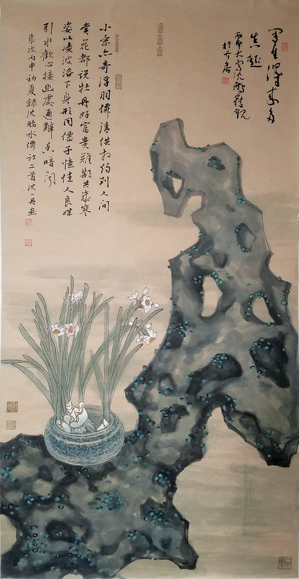 沈一丹把她的书画展命名为“碧海丹心”,我感到很有意味:有色彩,有形象,把自己的名字与海军连在一起了。还有她给自己的画室题名“沐兰轩”,单看“沐兰”便感受着兰花的幽姿。待细看,分明暗含着“花木兰”,“木”字左旁的三点水,既是“沈”,也有“海”。亏她这番琢磨,中国语言文字真妙!我认为屈原的“朝饮木兰之坠露”,也很可以为她的“沐兰轩”作注解。