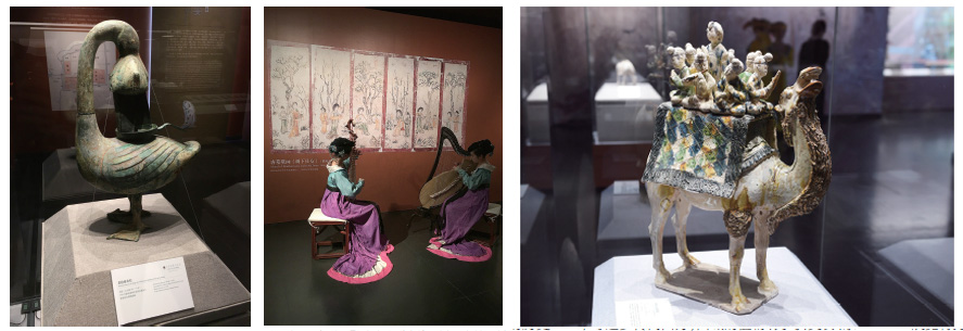 左起:1、彩绘雁鱼灯(西汉)2、唐墓壁画《树下仕女》3、三彩骆驼载乐俑(唐)