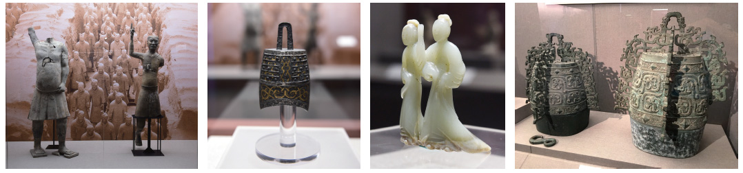 左起:1、百戏俑(秦)2、错金银乐府钟(秦)3、玉舞人(汉)4、秦公镈(春秋)