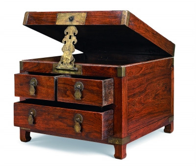 另一个清康熙时期的黄花梨带屉小箱则凸显出设计的精巧。此方角柜式箱,不设门板,外观即可见平列的两层抽屉,上层为二,下层为一,共三具,抽屉脸上饰菊花瓣护眼和瓶形吊牌。小箱正面镶长方形面叶,长长的云头纹状拍子,恰好扣入上下两个锁鼻,可单独打开上层或下层空间,顶盖掀起后,亦可以云头纹铜饰件支起,颇为巧妙。盖顶包铜角,四足下端包铜条,增加稳固性,底收扁马蹄。