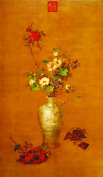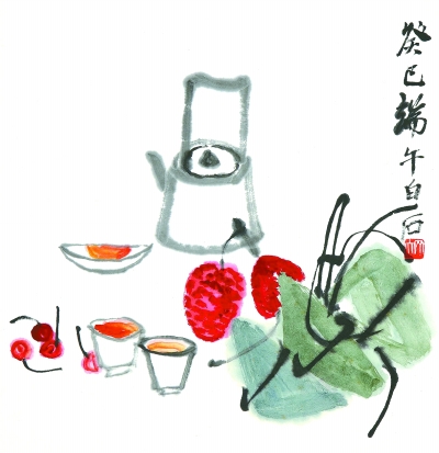 为中华文化所折服的西洋画家郎世宁,也来凑端午的热闹。温润厚重的青瓷花瓶、瑰丽华美的夏日之花,衬着青青的艾叶,透出繁荣的五月景象。几枚古铜色的包粽、一盒花果,画面烘托的是“富贵吉祥”的安康知足。