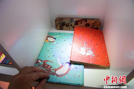 躁井壁画笔记本、藻井魔方、鼠标垫、马克杯、餐具、火焰纹伞,九色鹿环保袋、彩骨玲珑扇、行李牌、ipad壳、充电宝、骆驼笔筒……中新网记者近日在敦煌机场、景区、街市里看到,敦煌艺术以“萌态”形式悄悄闯入年轻人的时尚生活而倍加受宠。