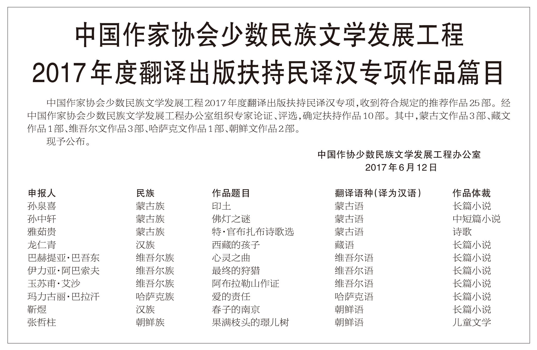 中国作家协会少数民族文学发展工程2017年度翻译出版扶持民译汉专项,收到符合规定的推荐作品25部。经中国作家协会少数民族文学发展工程办公室组织专家论证、评选,确定扶持作品10部。其中,蒙古文作品3部、藏文作品1部、维吾尔文作品3部、哈萨克文作品1部、朝鲜文作品2部。