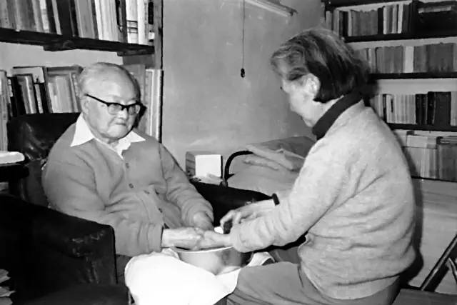 1985年张兆和为病中的沈从文洗手,李辉 摄。