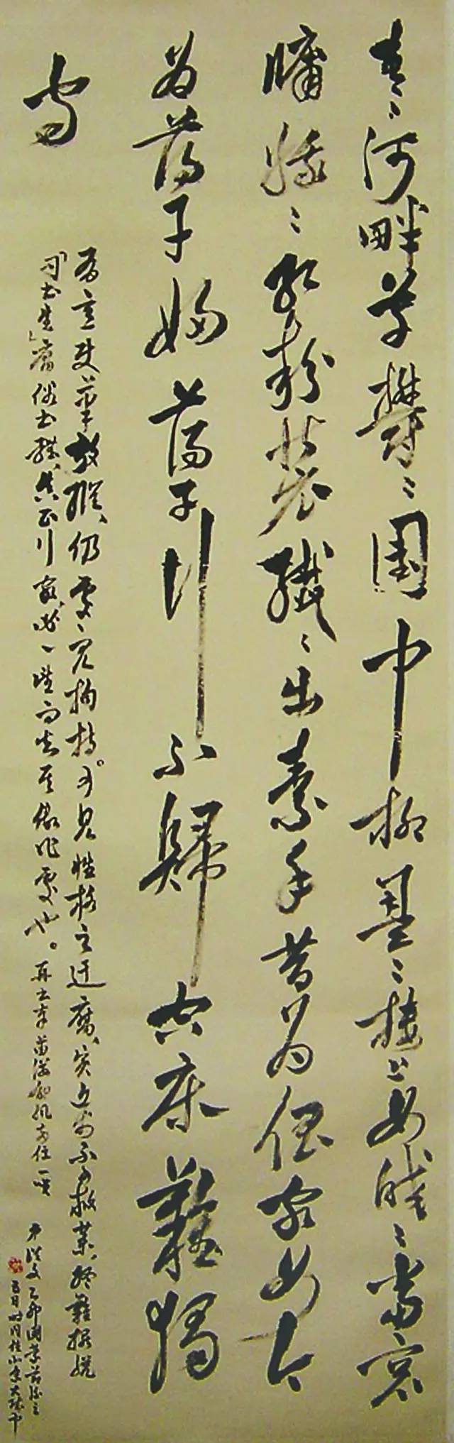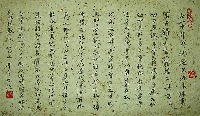 尚未在别处见到过沈从文谈论自己的书法,故此题跋有特殊意义。难得的是,苗子先生为此幅书法特地补写一题跋简述沈从文的书法艺术: