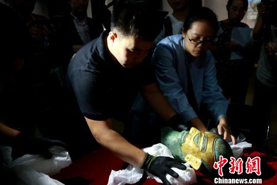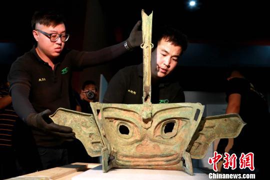 1986年三星堆遗址二号祭祀坑出土的铜戴冠纵目面具被工作人员仔细的开箱放入展台。 梁犇 摄