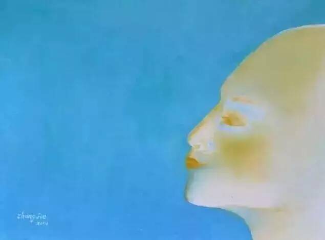 张洁的自画像我印象最深的有3幅,即《2014》《2011》《2014.2》。《2014》画的是一个光头女人,鼻子、嘴和下颚上扬,一种典型的冷峻高傲姿态,但她的目光却是平视的,眼神中隐含着既矛盾又有所期待的柔光,并与背景和远方的蓝色融为一体。