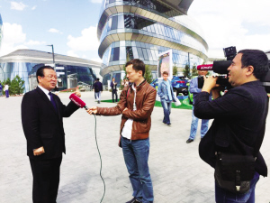 艾克拜尔(左一)在2017年阿斯塔纳世博会上接受哈萨克斯坦电视台记者采访。 艾克拜尔