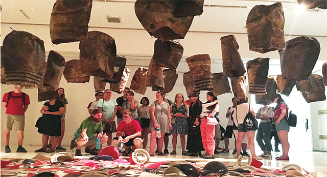 一件件来自西藏的破旧牦牛皮袋子倒挂在空中,艺术家在上面的画作成了点缀,它们用自身的形状、气味讲述着来自遥远藏地的独特故事。