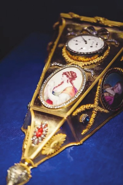 故宫藏18世纪西洋铜镀金美人图花插式挂表。西洋钟表曾作为西方传教士的礼物,敲开中国宫廷的大门。明代万历时期,利玛窦就曾赠送两座自鸣钟给万历皇帝,得到赞赏连连。自此以后西洋钟表逐渐进入宫廷,其中以英国、法国制造为主。这些钟表利用机械学、动力学原理巧妙设计,以水法、转花、西洋人物等机械转动配以计时,既精美又华丽,具有典型的西方装饰艺术风格,更具有陈设效果。乾隆皇帝尤其喜爱西洋钟表,更要求清宫造办处制作精美的御用时钟。