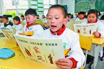 合肥市瑶海区蚌埠路第三小学,孩子们在阅读朗诵“传承好家风,弘扬正能量”系列读本。解琛摄/光明图片