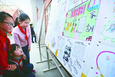 西安建国路小学,一个有关“家风家训”的手抄报展览吸引了许多人驻足观看。光明图片/视觉中国