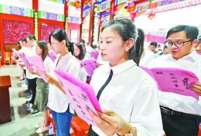 2017年“五四”青年节当天,福建省福安市组织年轻人开展“家风讲堂”活动,传承和弘扬优秀家规、家训和家风。新华社发