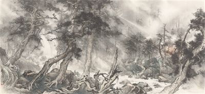 我们看到,老一辈艺术家重装上阵,焕发新生;新生代艺术家充满活力,独立多元。20世纪40年代便已活跃于左翼美术家阵营中的廖冰兄,再次发扬了左翼美术的批判传统,以自己为原型,创作了系列漫画《自嘲》,其历史价值与现实意义至今值得深入发掘。一生蛰伏的王肇民,此时亦走进收获季节,其兼有东方深沉与西方机敏的水彩艺术,被誉为西方写实主义绘画进入中国后达到成熟的真正标志之一。回归故土的广东籍画家赖少其,于此时期走上艺术巅峰,他所创造的墨色结构和图像风格,超越中西古今之辨回归大象无形的大自在境界,使中国画创新有了别树一帜的参照样式。而客居他乡的广东籍画家苏天赐,此际也创造出具有浓郁民族气派的作品,其笔下的生命意象文情荡漾、诗意弥漫,完美融合了“西方的缤纷”与“东方的空灵”。许钦松也是这一时期广东中国画的代表。他以别具心裁的微妙视角,将焦点透视表现的实在之景,营造出吞吐大荒的壮美之境,投射了沉思、叩问人与自然关系的主题。还有方楚雄、苏百钧以及郭润文、黎明、李劲堃、黄启明、张彦、许鸿飞、方土、冯少协、范勃、王绍强、林蓝等更年轻的艺术家们,纷纷运用形态各异的意象符号,来归纳或涵映时代。他们不仅触动了时代最敏感的琴弦,也在思想性和艺术性的双重变奏中实现了飞跃,共同玉成了这一广东当代美术史上最多元、最开放、最包容和最具活力的阶段。