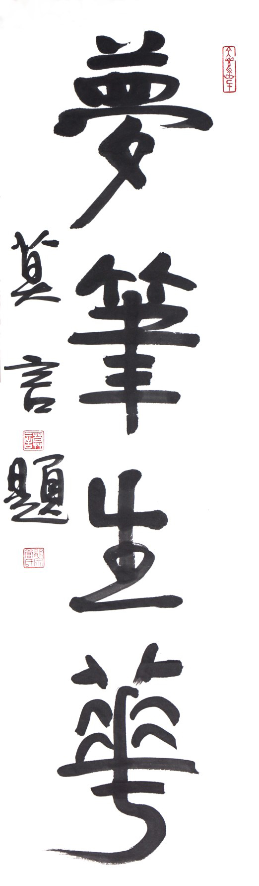 此次展览中莫言、李敬泽、欧阳江河、张大春、冯唐、杨葵、郑培凯、崔曼莉、徐则臣几位作家均有书法作品展出,风格各异。张大春学书以欧阳询开窍,其《行书自作登楼歌卷》潇洒自得,结字疏密匀停,争让得体,从其作品可见涵养和学问的深厚。郑培凯喜读帖,作品《我为你写诗》和《临江仙》结字平正安稳,气韵流畅,可见其对汉字结构和线条变化的深刻研究,颇有王羲之行书风范。莫言的《梦笔生花》,藏锋运笔,结字端庄,浑朴沉着;欧阳江河《以梦为马》的篆体纤细古拙,起笔宿墨与结尾飞白形成奇趣的艺术效果;李敬泽的隶书典雅朴厚,另有春秋。
