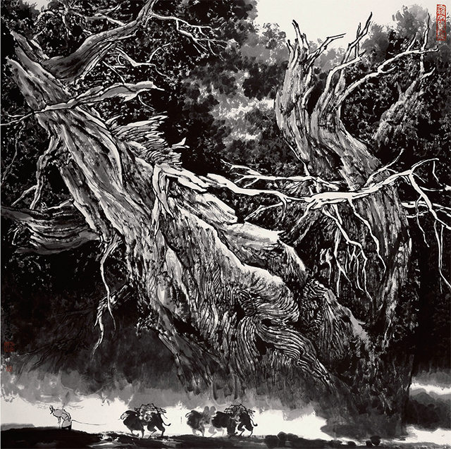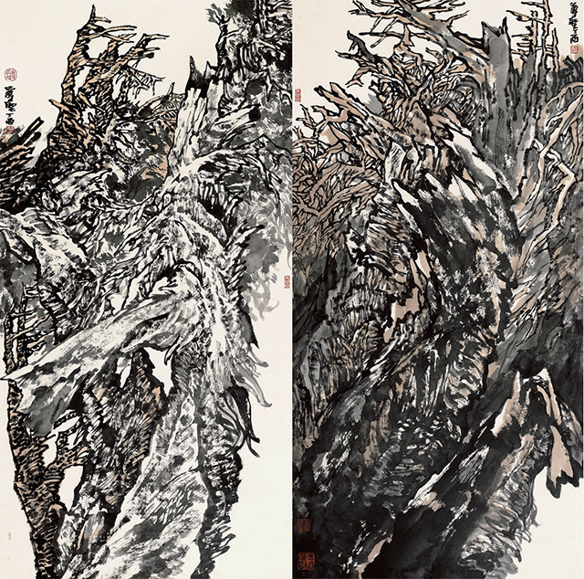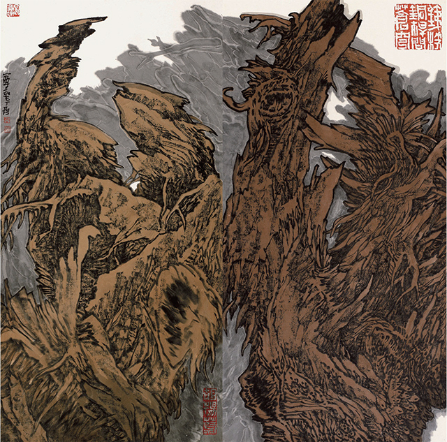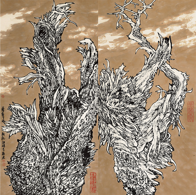 走进胡杨深处观察感悟,三个千年的神奇,后两个千年是表现的重点。粗大的树干矗立于荒漠,树叶被寒风吹尽,枝杈被风沙折断,树头也被无情的岁月斩去,只有千年不倒的身躯傲然挺立,似人体雕塑的残缺,皮肤、筋骨、血液,给人心灵的震颤。与天对吼的大嘴,与大漠狂舞的英姿,哭诉的胡杨泪,硕大的眼睛直视苍穹,是渴望生命的神情,是不死不朽的传情,无不发出内心的呐喊和激荡。手在抖心在跳,难以抑制的激情,无食、无眠,是出现满意作品还是被胡杨的神情感动?在情与泪、水与墨的交融中,我找到了胡杨的“魂”与“神”。