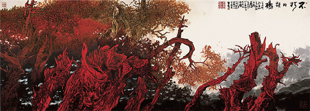 就这样不倒、不朽从远古站立到今天,我与胡杨相遇,用翰墨真情书写不朽的胡杨。办画展不是为了证明什么,也不是比什么,重要的是在做什么,或能做什么,我只能画画,就尽我所能把画画好。感谢胡杨大树,感谢中国画艺术,给了我一个以艺术的方式赞美生命的机会。