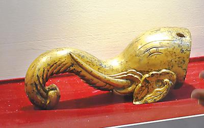 同时,我们注意到发掘于圆明园大宫门遗址御河内的铜鎏金象首,象牙微挑,眉目传情,脉络清晰,闪闪发亮,吸引游客驻足欣赏。“铜鎏金象首的制作工艺要远远在十二生肖之上,是清代皇家用器精品”,张利芳说。据悉,铜鎏金制品目前挖出仅此一件。