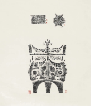 “传拓”俗称拓片,若要对青铜器器形进行传拓,就必须采用全形拓的方法。全形拓是一种以墨拓作为主要手段,将古器物的立体形状复制表现在纸面上的特殊传拓技法,又名“立体拓”“器形拓”“图形拓” 。“黑科技”的产生必然有个传说:相传清嘉庆年间,苏州焦山寺有一尊青铜鼎,寺僧六舟和尚秉烛赏鼎,发现墙上映出鼎的影像。他灵机一动,把原器的尺寸量好画出轮廓,再以厚纸做漏子,用极薄六吉棉连纸扑墨拓,这样青铜器爱好者们不用登门也能见识鼎的形象。这种拓前需先用白芨水刷在器物上,再用湿棉花上纸,待纸干后,以绸包棉花拓印额形式,就是全形拓。它要求拓技者具备熟练的素描、绘画、裱拓、传拓等技法,把器物原貌转移到平面拓纸上的一种特殊技艺。一时间,全形拓工艺成为潮流,无数文人墨客、金石学家都沉浸在全形拓的乐趣中,金石学家阮元还邀六舟和尚将家藏青铜器全部制成全形拓,而全形拓也为他们欣赏研究青铜器提供了非常难得的材料。