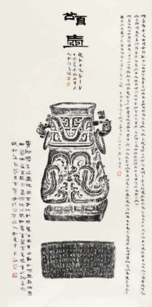 周希丁的弟子傅大卣继承了他全形拓的技艺,而贾文忠正是师从于傅大卣的传承人。自幼受家庭熏陶酷爱金石书画的贾文忠十几岁即随父习业,深得铜器修复要领,又拜康殷、傅大卣等为师,学习金石篆刻、书画、鉴定。他先后在北京市文物局、首都博物馆、中国农业博物馆从事文物保护、修复、鉴定、研究等工作近40年,修复过数千件青铜器,鉴定青铜器不计其数,其中不乏国宝重器,这使他有机会创作全形拓,并在全形拓基础上潜心研究颖拓技艺。据他介绍,当代青铜器全形拓的拓法是在拓器物前,选择最能代表该器物特征的最佳角度,用铅笔在准备好的棉连纸上画出一个“⊥”形图,以表示器物的垂直线和水平线,再在“⊥”形图上标出器物的高度、宽度为基础,画出被传拓器物原大的线描图,随后把标有器物各部位位置的棉连纸分先后覆在被拓器物上,用蘸有白芨水的毛笔刷湿,上纸,用棕刷刷实,用墨拓黑后揭下,这样多次拓完器物的各个部位,完成全形拓。他采用了古人传统全形拓方法,所拓器物全形准确与实物不二,透视合理,纹饰清晰、丝丝入扣、铭文规范、笔画有序、效果逼真、赏心悦目,作品更邀请多位艺术家为之补绘或题跋,既充分展现了传统技艺之美,又有当代文化的介入,文质兼备。