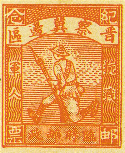 抗日战争中,人民军队是抗战的“中流砥柱”。1938年,晋察冀边区临时邮政总局发行了“军人免资贴用”邮票,即珍邮“抗日军人图”(图③)。这枚邮票,留下了那个艰苦年代的印记。画面以质朴简约的线条,勾勒出抗日军人持枪向前线的形象。颇具时代感的劲砺的木刻风格,富有动感和感召力,虽不华但有气度,虽简单但蕴内涵。红色的单色印制,又若烽火燃起的战场,具有引发联想和置身实地的双重艺术效果。