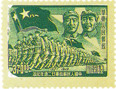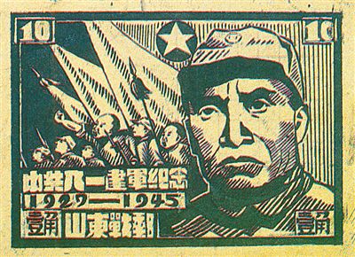 1945年10月,山东解放区的山东战时邮务总局发行了第一枚“中共八一建军纪念”邮票(图⑨)。这一枚邮票,主图是朱德总司令威严的戎装肖像,背景是军旗引导下的军队行进。主图之外的边饰,印有“中共八一建军纪念”“1927—1945”和“山东战邮”的字样。
