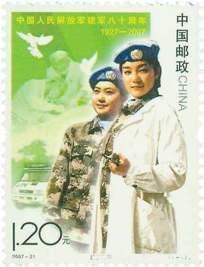 2007年发行的建军纪念邮票,全方位表现了人民军队的神圣职责。邮票上,第一次出现了军旗辉映下的抗洪抢险场面,以及参与联合国维和行动的中国军人的英姿(图⑧)。这套邮票以“听党指挥”“服务人民”“英勇善战”和“维护和平”四幅邮图,表现了可以信赖、可以依靠的人民军队。新世纪的绚丽色调,让这套具有革命传统的主题邮票,有了焕然一新的神采面貌。